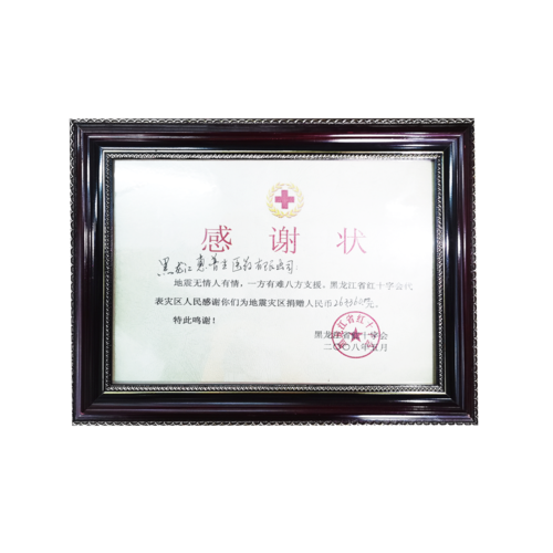 为汶川地震捐赠,获得黑龙江红十字会颁发的公益企业证书
